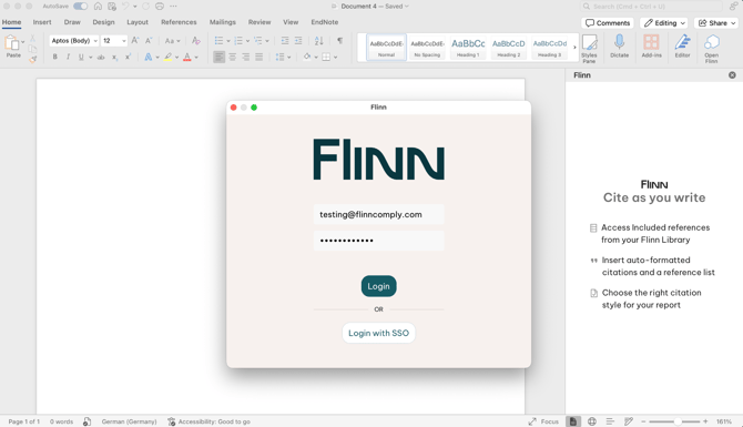 Open Microsoft Word, launch the Flinn add-in from the Add-ins menu, and log in using the email and password credentials to your Flinn account.