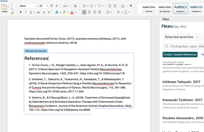 - Flinn creates (or updates) a references section at the very end of the Word document.