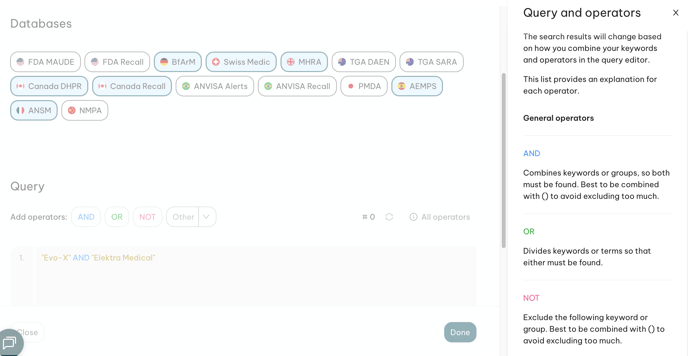 💡 Advanced operators such as Product Code or Exact Term can also be valuable in enhancing the quality of your query. For a detailed explanation of each operator and best practices, please refer to the following page: Create an advanced boolean query